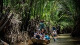 ルフィの位置(船主)に座り、ガイドするガイドさん。英語が話せないベトナム人がほとんどらしいですが、彼女は流暢に話します。両親が富裕層なのかな?